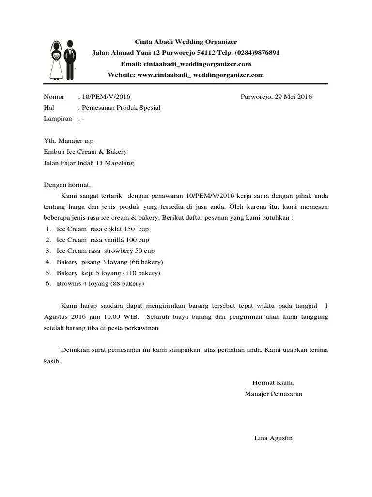Atas kerjasamanya kami ucapkan terimakasih. 2 berperanlah sebagai pemilik jasa penyelenggara pesta kemudian tulislah surat balasan produk kue dan ice cream kepada ladzidzan ice cream bakery. 10 salam penutup surat, diikuti nama, jabatan, dan tanda tangan penanggung jawab surat. surat penawaran ladzidzan surat balasan ladzidzan ice cream dan bakery contoh seputar surat dari segi format serta tulisan yang baik dan benar pada contoh surat menjadikan acuan kredibilitas dari sang penulis. Hormat kami, marhaban wedding organizer ananta setya surat lamaran kerja yang benar dan baik; Penawaran produk spesial lampiran : Contoh surat balasan zona ilmu 6. Pemesanan ice cream kpd yth marketing manager ladzizan ice cream and bakery. Contoh surat penawaran produk elektronik document pinterest. surat balasan ladzidzan surat balasan terhadap surat penawaran ladzidzan ice cream bakery yaitu kop surat marhaban wedding organizer jalan kartini kota batu jawa timur. Contoh surat balasan penawaran ladzidzan ice cream dan bakery contoh kasus perceraian pengadilan negri di luar islam laman 12 Berperanlah sebagai pemilik jasa penyelenggara pesta, kemudian tulislah surat balasan produk kue dan ice cream kepada ladzidzan ice cream &