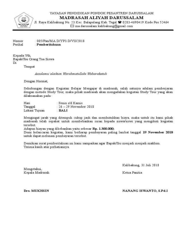 The collection that consisting of chosen picture and the best among others. Pemotongan gaji bagi karyawan dengan status pkwt. Contoh surat pemberitahuan study tour untuk wali murid. Contoh surat pemberitahuan study tour. 2 comments on contoh surat pemberitahuan study tour mts mu ya ikhsan.